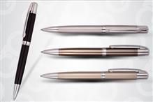 Caneta metálica com detalhes em prata, uma gravação já inclusa.
