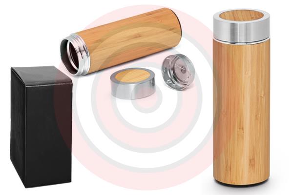 Garrafa Térmica Bambu - 1... Garrafa térmica. Bambu e aço inox. Com parede dupla e infusor para chá. Capacidade até 430 ml. Fornecida em caixa presente. Food grade. ø69 x 207 mm - Caix...